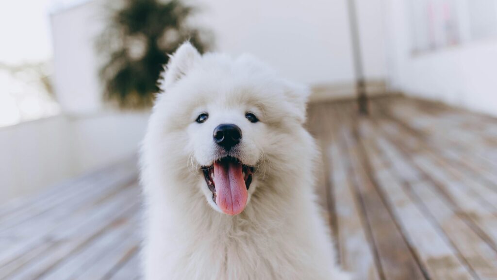 サモエドスマイルと呼ばれる愛らしい笑顔が特徴の白いもふもふ。